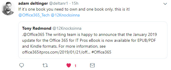 Mary-Jo Foley and Paul Thurrott gave the book a nice shout-out on Windows Weekly #784. You can hear what they said on the video/audio. Our favorite comment is when Mary-Jo says “if you’re an [Office 365] admin, you basically need and want this book.“