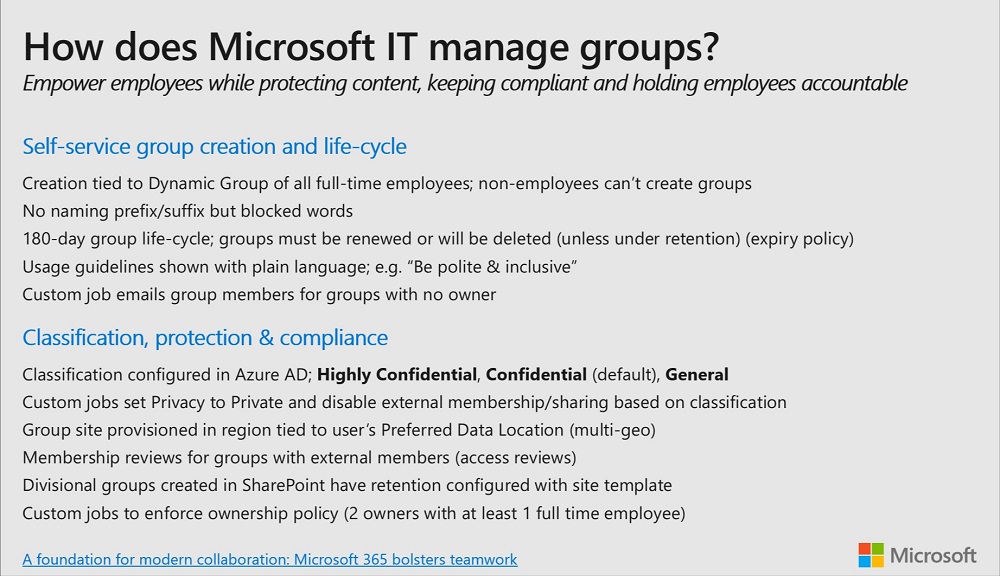 Details of how Microsoft IT manages its deployment of Office 365 Groups were discussed at the recent Ignite 2018 conference. It’s a good idea to write down the basic framework of your Office 365 Groups deployment, if only to understand how all the different policies and features fit together.