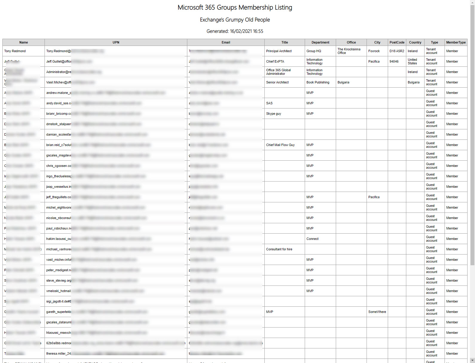 Many people want to print off membership details of Microsoft 365 groups, which makes it curious why Microsoft doesn’t support the option in Teams, OWA, or other applications. Fortunately, it is very easy to extract and report membership with PowerShell. Here’s how to generate a HTML report with a CSV file on the side.