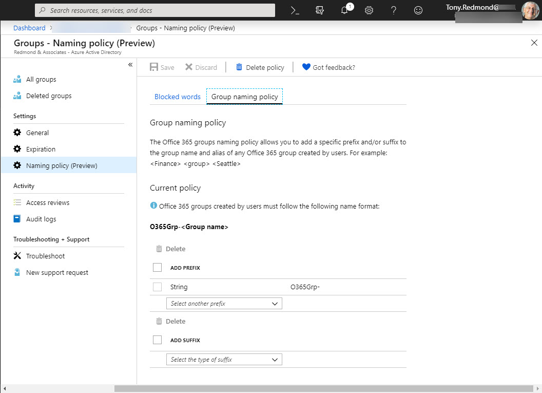 The Groups section of the Azure Active Directory portal now includes a preview of a feature to configure the Office 365 Groups naming policy without going near PowerShell. Although those proficient with scripts and GUIDs will lament this sad reduction in standards, the normal administrator will welcome the chance to forget some obscure syntax.