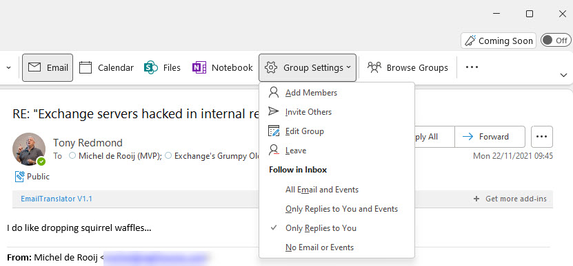It might seem like a small thing, but some users are upset when they don’t receive copies of their messages sent to Outlook Groups in their Inbox. A new setting allows users and administrators to control if they receive copies of messages from groups, but only when the user is a subscriber to groups (Follow in Inbox is turned on). In this article, we explore how to set the EchoGroupMessageBackToSubscribedSender control via OWA options and PowerShell, and how to sign up to be a group subscriber by yourself or with a little help from an Exchange administrator.