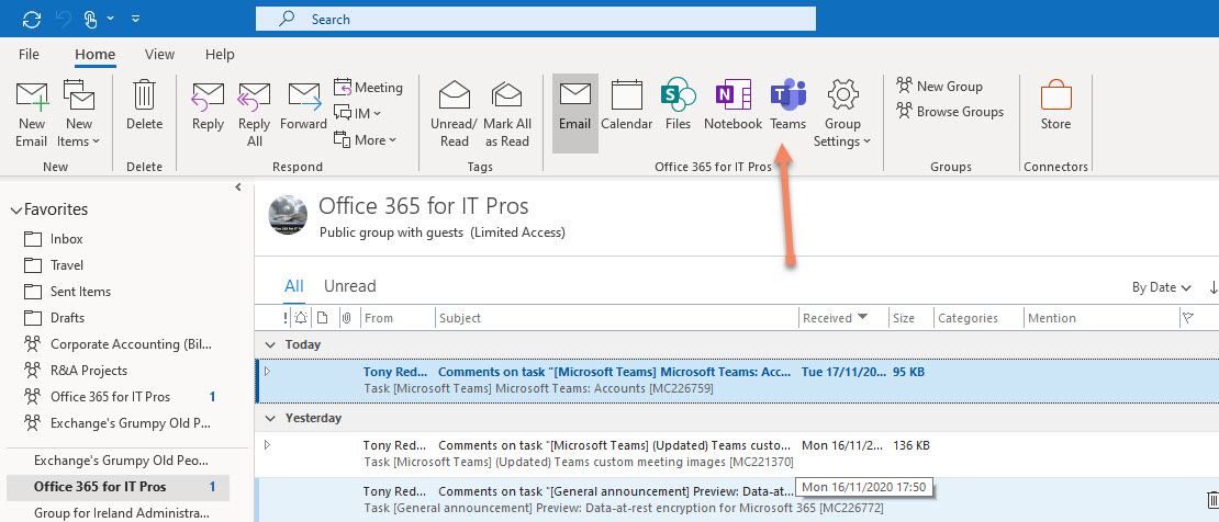 Outlook for Windows has a Groups menu bar which is displayed when conversations in a Microsoft 365 group are accessed. A new Teams button is available to bring users to the General channel of team-enabled groups. It’s an interesting decision by Microsoft to add the button because I am not quite sure if any need exists for such a facility.