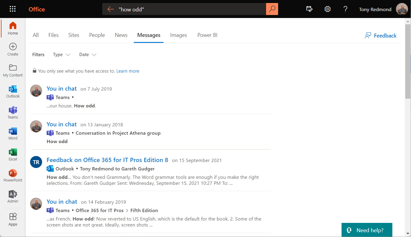 If you run a search in Office.com, Microsoft Search now includes Teams and Outlook messages in its results. This is similar to the capability exposed when Bing.com connects Microsoft Search to include work items in its results. Loop components are also available in search results.