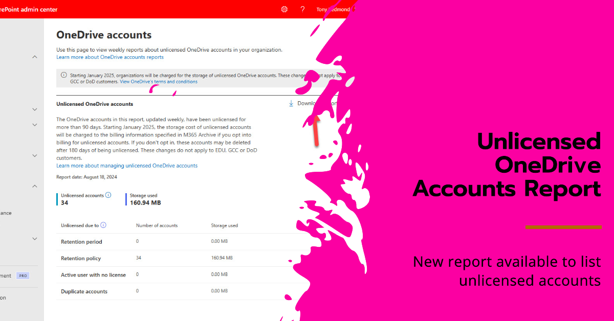 Microsoft announced their plan to charge for unlicensed OneDrive for Business accounts in July. Now we have an unlicensed OneDrive accounts report in the SharePoint Online admin center. The report divides unlicensed OneDrive accounts into four categories and it’s up to Microsoft 365 tenant administrators to figure out whether to retain or remove unlicensed accounts before automatic archival comes into force in January 2025.