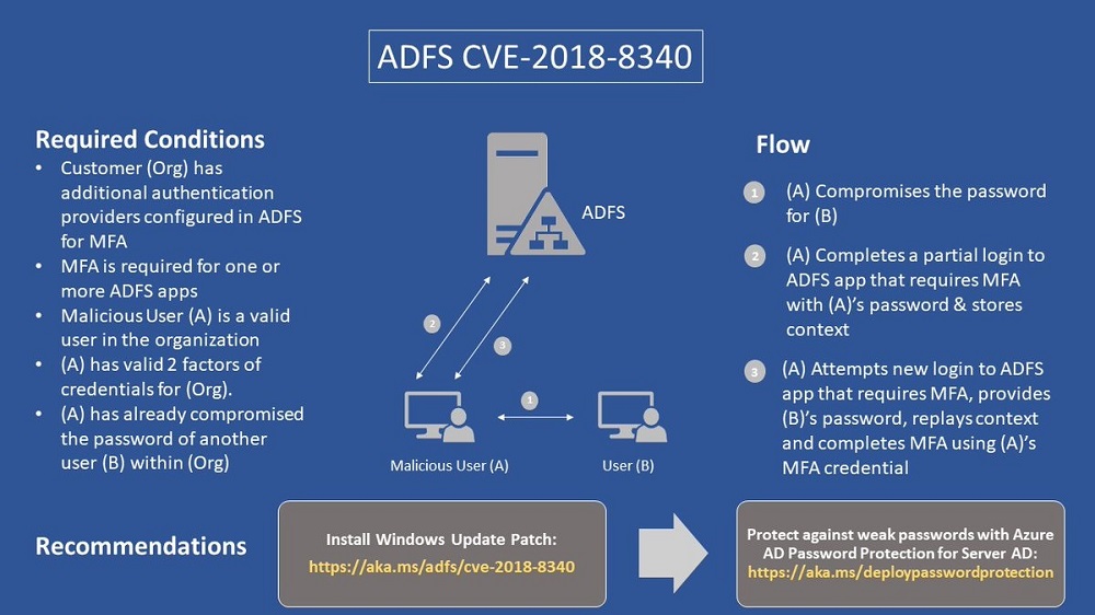 Microsoft has issued patch CVE-2018-8340 to fix a problem with Active Directory Federation Services. You should download and install this patch now.