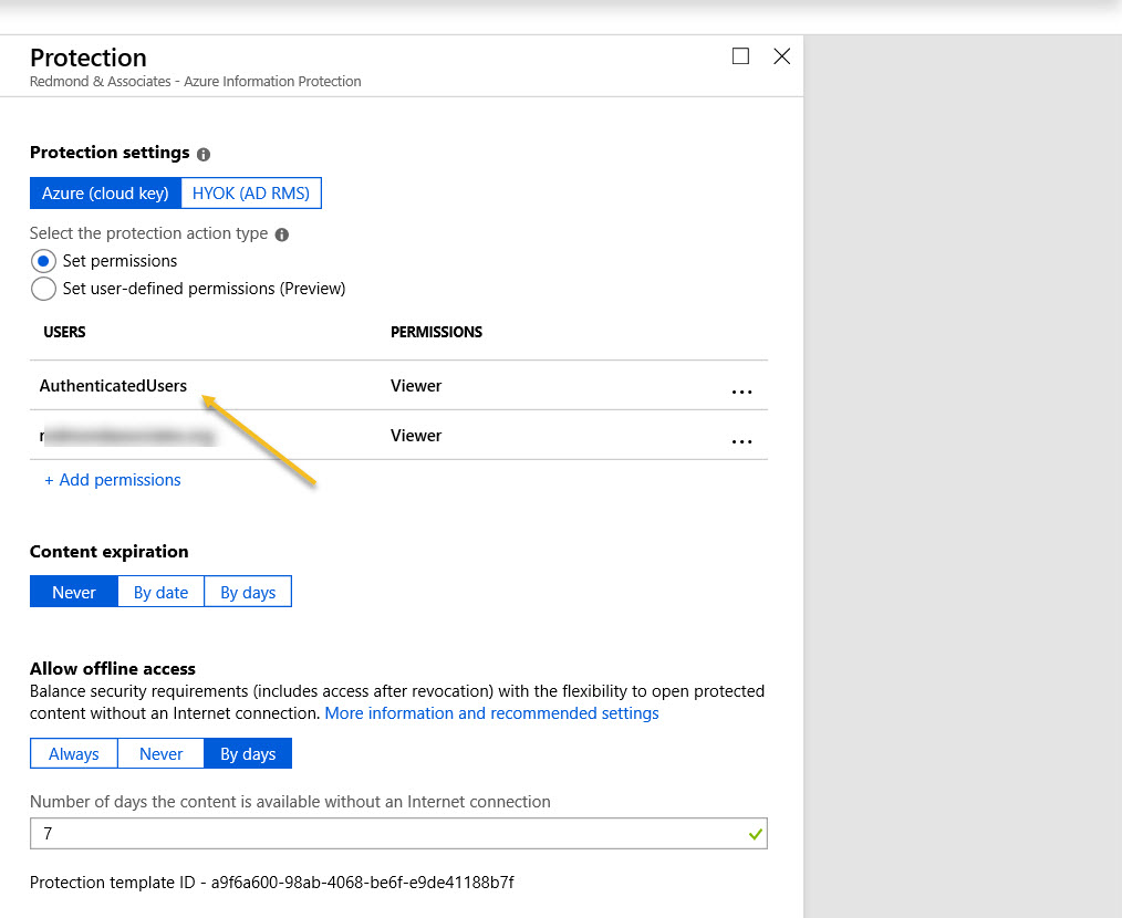Azure Information Protection rights management templates now support the Any Authenticated Users permission to allow Office 365 users to share email and documents with anyone who can authenticate with Azure Active Directory or has an MSA account or uses a federated service.