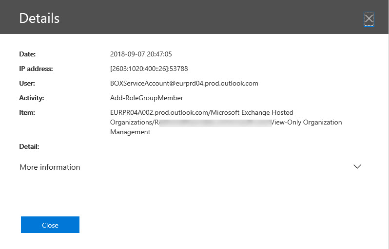 Records featuring an account called BOXServiceAccount appear in the Office 365 audit log. Not much information is available about the account, but it’s all OK because it’s used to assign administrative roles to Office 365 accounts.