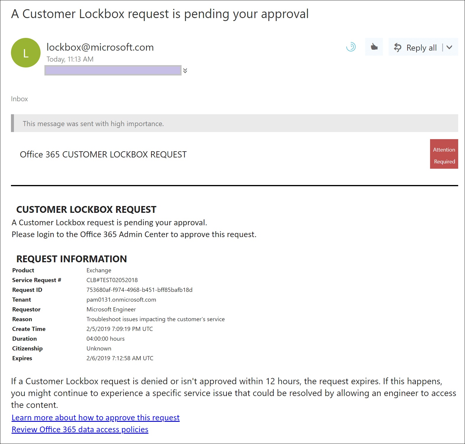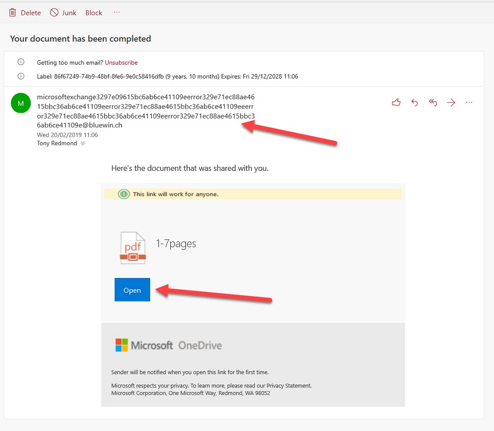 Phishing attacks through email happen all the time. A new relatively crude one arrived today. It’s easy for the trained eye to detect phishing, but do your Office 365 admins know how to use the tools available in Exchange Online Protection to suppress malware, and do your users know the signs of bad email? In this case, it’s an invitation to click to get to a PDF document to bring you to digitaloceanspaces.com. Some interesting things might happen afterwards, but I really don’t want to find out what occurs when I click the link.