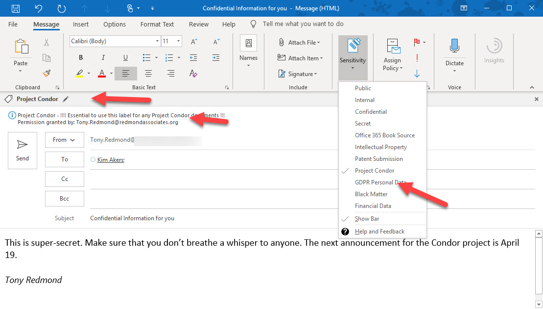 Rights management and encryption are likely to be a much more common Office 365 feature in the future. Sensitivity labels makes protection easy for users to apply through Office apps. The downside is that protection makes content harder to access for some Office 365 and ISV functionality.