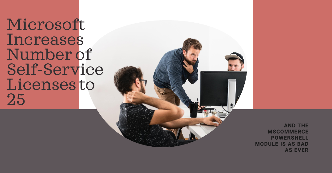 A new major version of the MsCommerce PowerShell module makes you hope that something good is included in the new code. In this case, it’s hard to know if the developers did anything but increase the major version number for the MsCommerce module. Not much has changed. The module is as bad as ever, but at least it can be used to disable self-purchases of all supported licenses, which is all that’s really important.