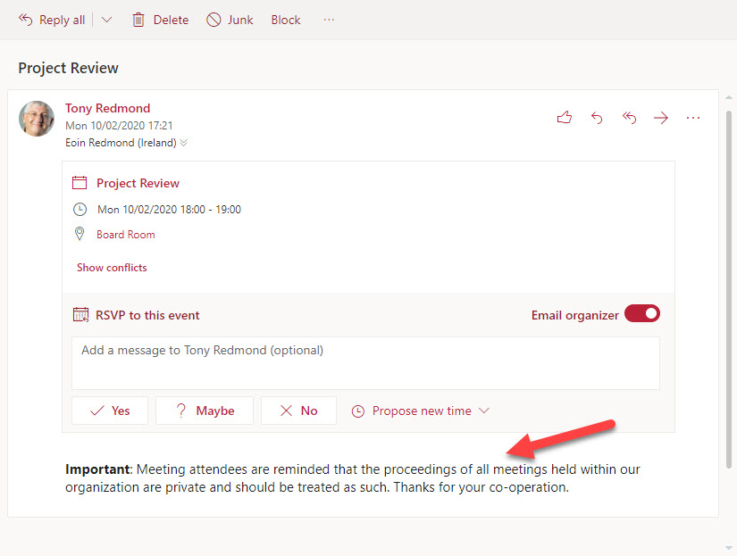 Exchange Online’s calendar assistant is good at responding to meeting requests for rooms. It can be even better with just a little customized text to remind those who book the rooms about meeting etiquette. Even though we might never get back to physical meetings in conference rooms, some face to face gathering will happen in the future, so now’s the time to prepare for bookings to be handled in a nicer fashion.